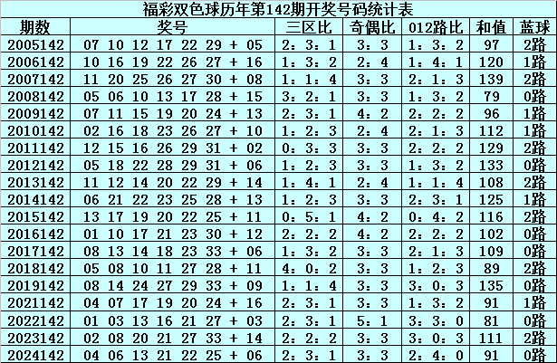 在第142期历史同期奖号中,红球三区分布总比例为29:47:38,奇偶总比例为59:55,012路比为32:42:40,和值分布在79-139之间,蓝球号码012路总比例为7:5:7。