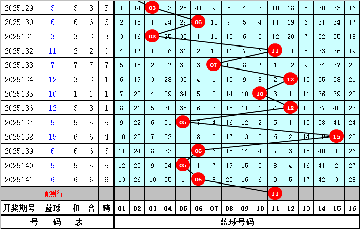 在历史同期第142期开奖中:蓝球号码012路比为7:5:7,本期注意蓝球开出2路号码,精选蓝球号码11。