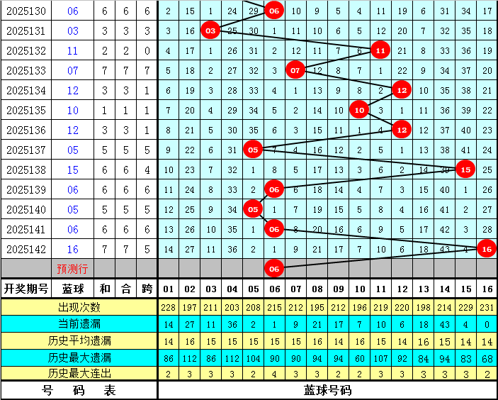 遗漏分析:最近7期红球遗漏总值分别为:19、29、11、53、38、6、30,开出5个遗漏值9以上的冷码红球,目前红球遗漏值9以上的冷码红球有4个:06、07、16、21,本期不看好这几个冷码,预计继续轮空。