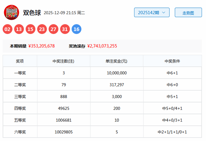 开奖回顾:双色球第2025142期奖号为:02 13 15 23 27 31 + 16,其中红球号码奇偶比为5:1,大小比为3:3,012路比为2:2:2,三区比为1:2:3。