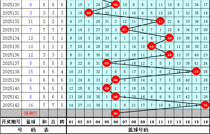 在历史同期第143期开奖中:蓝球号码012路比为6:7:6,本期注意0路蓝球出现,关注蓝球号码06。