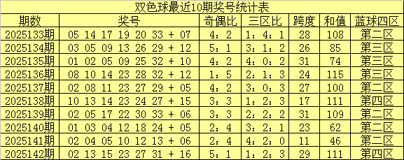 南华天第2025143期双色球区间号码个数统计分析:(红球:01-11为一区,12-22为二区,23-33为三区;蓝球:01-04为一区,05-08为二区,09-12为三区,13-16为四区)