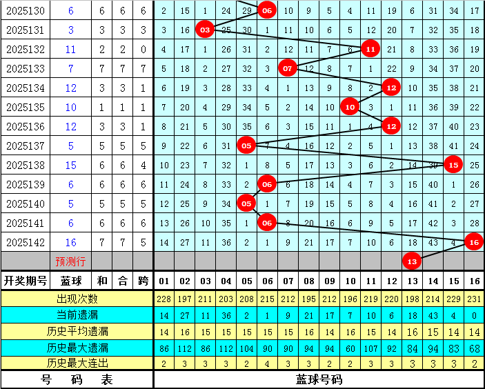 蓝球分析:前5期蓝球号码分别开出:15、06、05、06、16,其中奇数蓝球出现了2次,走势较冷,本期适当关注奇数蓝球回补,看好蓝球号码13。