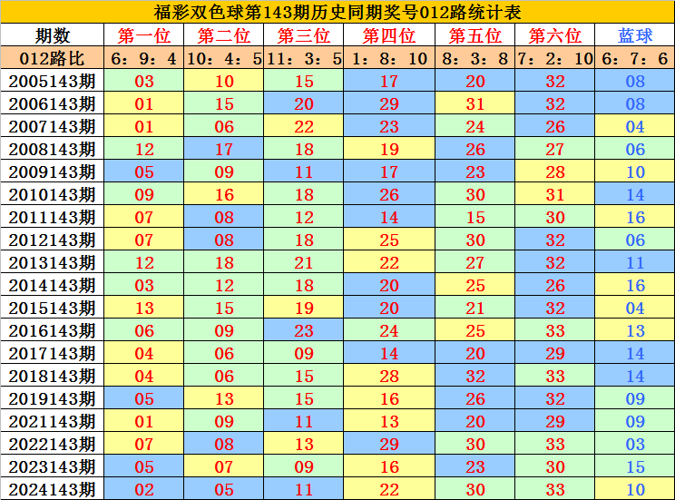 蓝球分析:第143期历史同期蓝球号码012路比开出6:7:6,在前9年同期奖号中,2路蓝球明显走冷,本期防2路蓝球再次轮空,关注蓝球03。