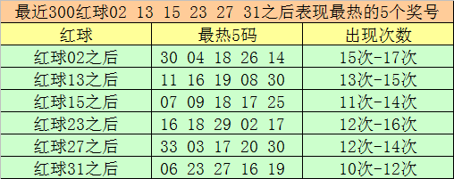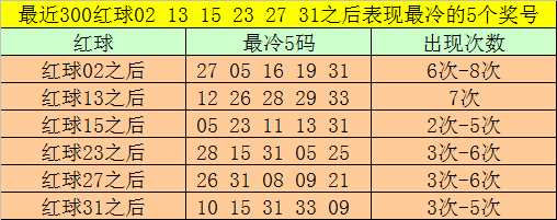 红球冷码统计:双色球第2025142期开出红球奖号分别为:02、13、15、23、27、31,在最近300期开奖中,各号码出现之后其下期出现最少的5个红球分别为: