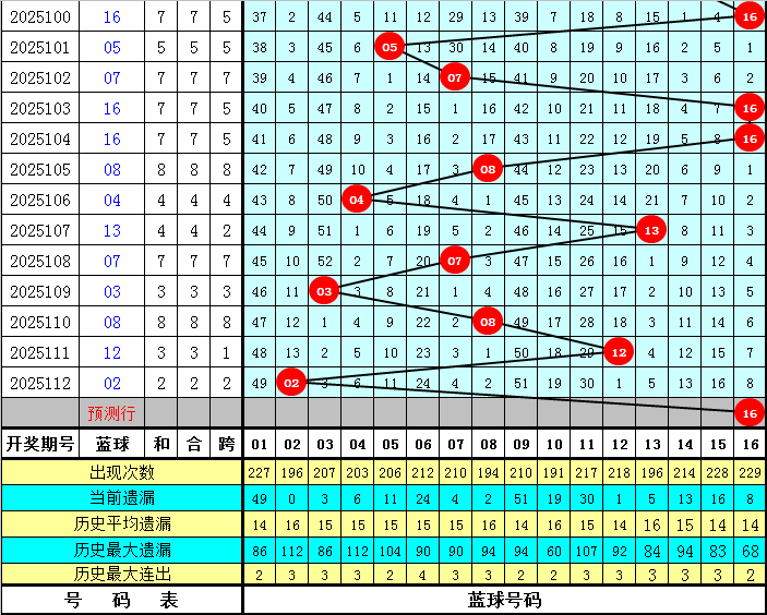 蓝球:上期蓝球号码为02,开出偶数、小 号,蓝球最近7期大小比为2:5,本期注意大号蓝球出现,蓝球关注16。