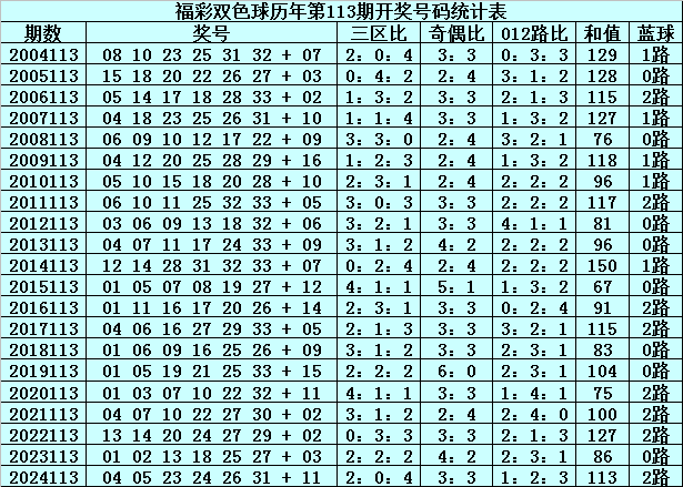 在第113期历史同期奖号中,红球三区分布总比例为43:36:47,奇偶总比例为64:62,012路比为38:49:39,和值分布在67-150之间,蓝球号码012路总比例为8:5:8。