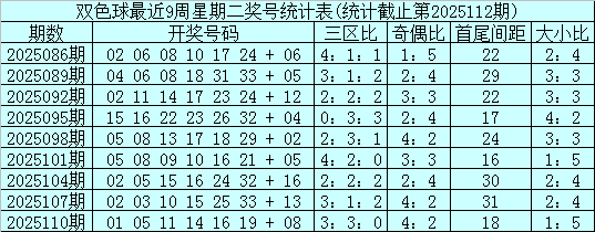 上期开奖:福彩双色球第2025112期奖号为:03 09 11 13 20 32 + 02,其中红球三区比为3:2:1,奇偶比为4:2,首尾间距为29,大小比为2:4。