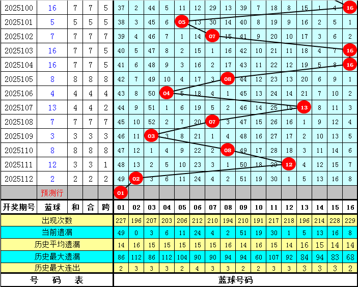 一号球分析:上期开出奖号03,该位最近10期出现范围在01-13之间,中位号码为07,其中小于中位号码的奖号开出8次,大于中位号码的奖号出现2次,中位号码07没有出现,本期该位继续关注中位号码以下的红球,考虑号码01。