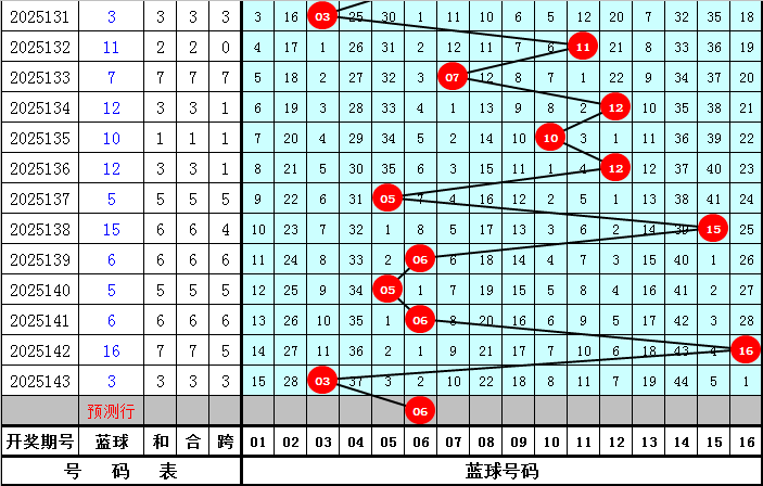 蓝球分析:第2025143期开出蓝球03,最近10期蓝球号码遗漏期数分别为:22期、8期、1期、35期、41期、8期、2期、1期、28期、11期,第2025144期蓝球注意01-09段出号,重点关注0路蓝球,参考蓝球:06。