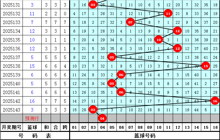 蓝球分析:去年第144期蓝球奖号为11,开出2路蓝球,目前1路蓝球轮空3年,今年同期适当关注1路蓝球回补,看好号码04。