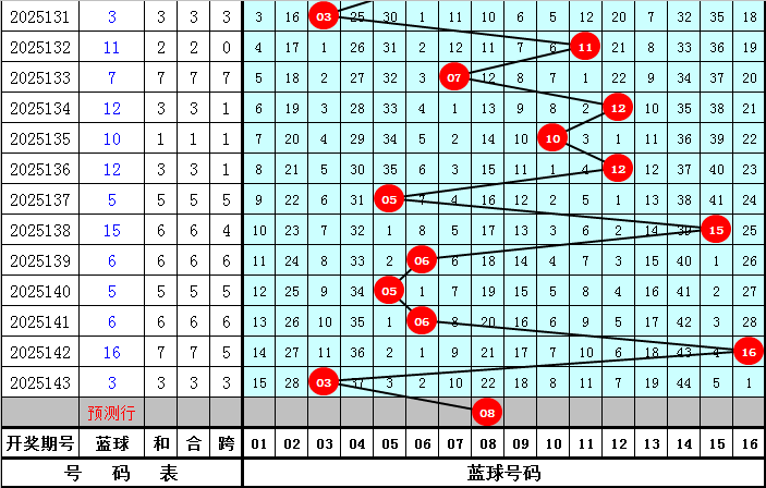 蓝球号码:最近9期分别开出蓝球号码10、12、05、15、06、05、06、16、03,蓝球号码012路个数比为5:2:2,其中1路蓝球走势较冷,本期防轮空,关注蓝球02、08、11、14。