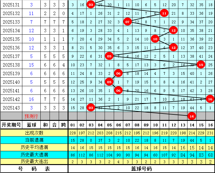 蓝球分析:前5期蓝球号码分别开出:06、05、06、16、03,其中偶数蓝球开出了3次,出现比例较高,本期预计蓝球再出偶数,参考蓝球号码14。