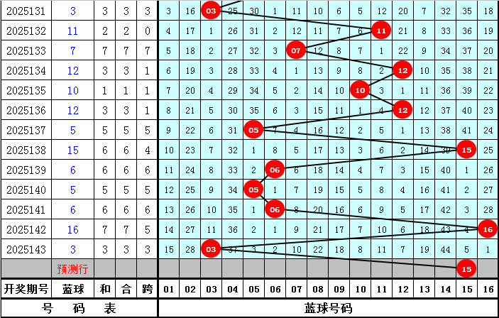 蓝球分析:上期蓝球奖号开出03,为小 号,上周日蓝球奖号开出06,最近十周日蓝球号码大小比为7:3,大号蓝球明显较热,本周日注意大号蓝球继续开出,参考蓝球号码10、13、14、15、16。