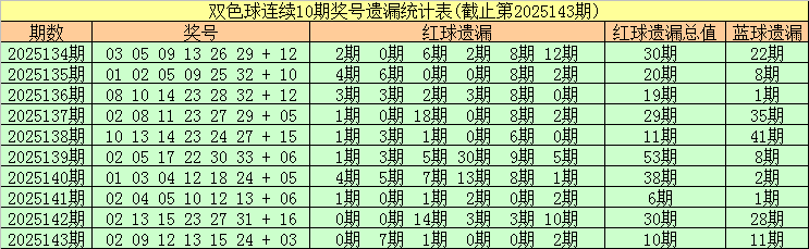 截止双色球第2025143期,最近10期红球遗漏总值分别为:30期、20期、19期、29期、11期、53期、38期、6期、30期、10期,上期遗漏总期数相对较低。