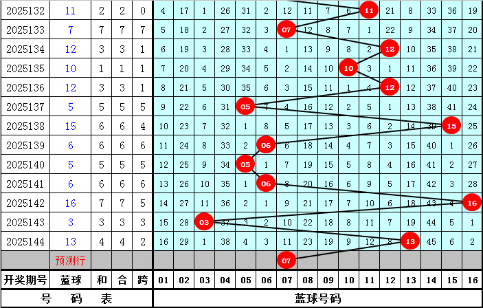 蓝球号码分析:最近30期蓝球号码质合比为16:14,最近10期蓝球质合比为4:6,最近5期蓝球分别为:05、06、16、03、13,本期看好蓝球为质数号码,参考号码07。