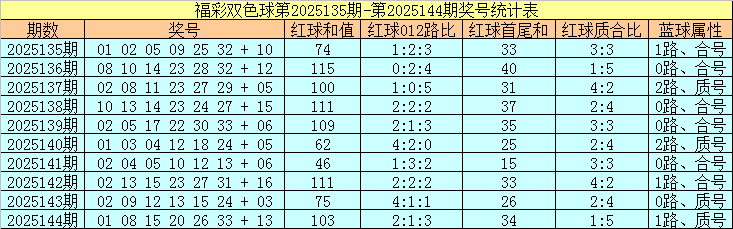 福彩双色球第2025144期红球奖号为:01、08、15、20、26、33,蓝球奖号为:13,其中红球和值为103,012路比为2:1:3,首尾和为34,质合比为1:5,蓝球属性为1路、质号。