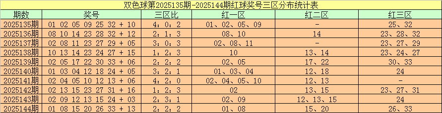 双色球第2025144期奖号为:01 08 15 20 26 33 + 13,红球三区比为2:2:2。