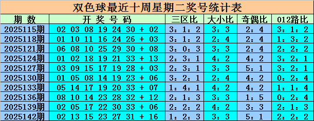 三区间分布分析:上周二第25142期奖号为:02、13、15、23、27、31+16,区间比为1:2:3。本期预计红球各区平衡,看好区间比:2:2:2。