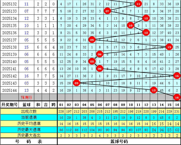 和值跨度分析:上期和值开出103,对比第2025143期和值上升了28个点位,本期看好和值走小,关注小 号区域和值,预计在109周围开出。