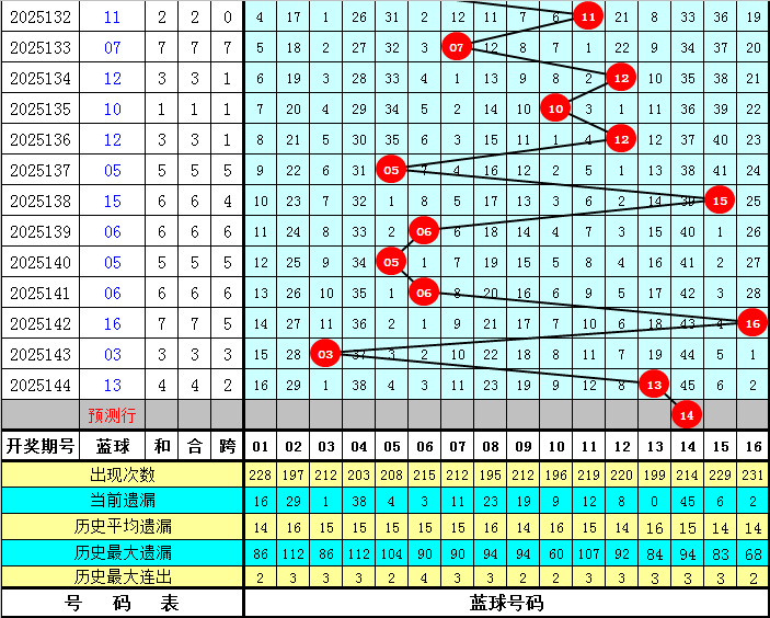 上期开奖:福彩双色球第2025144奖号为:01 08 15 20 26 33 + 13,红球和值为103,最大间距为7,奇偶比为3:3,三区比为2:2:2。