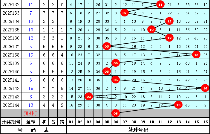 蓝球号码:最近9期分别开出蓝球号码12、05、15、06、05、06、16、03、13,蓝球号码012路个数比为5:2:2,其中1路蓝球走势较冷,本期防轮空,关注蓝球03、06、12、15。