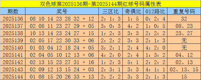 福彩双色球第2025144期奖号为:01 08 15 20 26 33 + 13,红球奇偶比为3:3,三区比为2:2:2,012路比为2:1:3,重号:15。