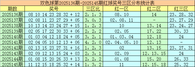 红三区(23-33):上期该区走温,开出2个红球,该区最近10期红球个数分布为:3、3、3、2、1、0、3、1、2、2,共开出20个红球,出号比例与理论个数基本持平,本期看好红三区走热,开出3个红球,红三区大范围关注:25、28、30、32、33,红三区精选红球:28、30、32。