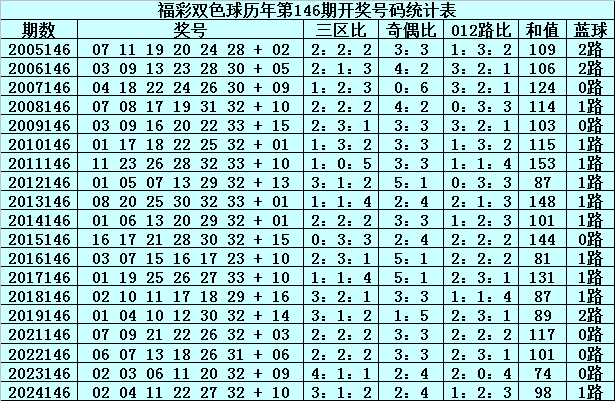 在第146期历史同期奖号中,红球三区分布总比例为37:33:44,奇偶总比例为56:58,012路比为31:40:43,和值分布在74-153之间,蓝球号码012路总比例为6:10:3。
