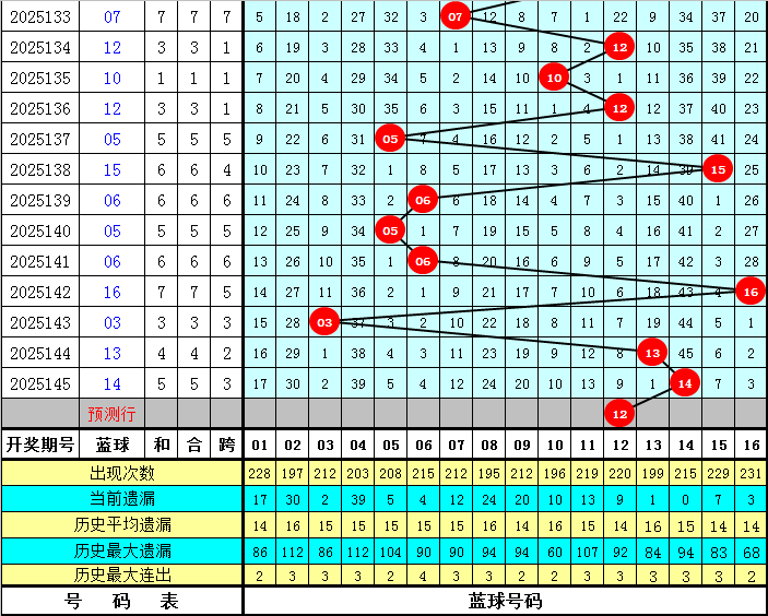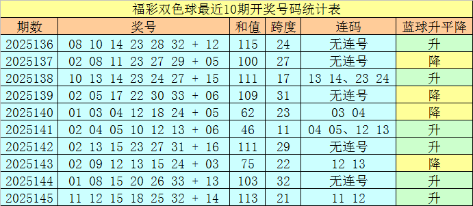 上期开奖:福彩双色球第2025145奖号开出:11 12 15 18 25 32 + 14,红球号码和值为113,首尾间距为21,包含连号:11 12。