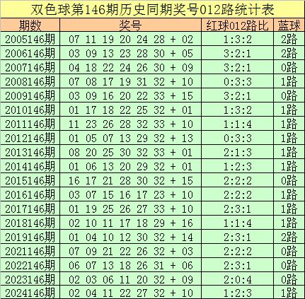 福彩双色球第2025146期历史同期王守礼012路奖号遗漏分析: