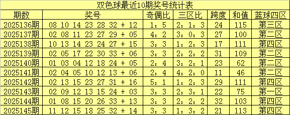 双色球第2025145期开出奖号:11 12 15 18 25 32 + 14。其中红球三区比为1:3:2,和值为113,奇偶比为3:3,跨度为21,蓝球第四区落号。
