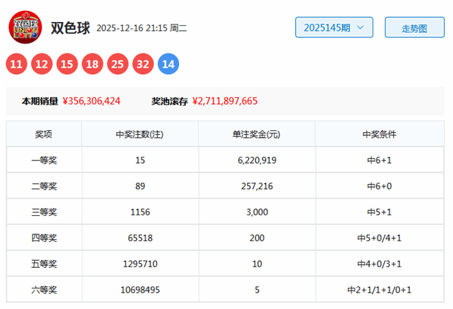 双色球第2025145期开奖号码为:11、12、15、18、25、32+14。其中红球三区比为1:3:2,奇偶比为3:3,包含1个重号:15,蓝球出现在第四区。
