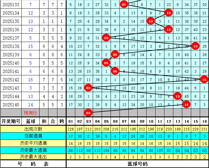 蓝球分析【一区01-04,二区05-08,三区09-12,四区13-16】:上期蓝球为14,出现在第四区,近50期区间比为11:13:12:14,近10期区间比为1:4:1:4,本期关注第一区蓝球号码,参考蓝球03。