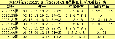 第一二位红尾分析:最近7周星期四红球第一二位尾数分别开出:39、20、33、35、28、13、29,同尾号开出较多;在最近7周星期四尾数分布中,尾数4、6、7轮空,尾数0、2、5、8出现1个,6、9出现2个,3出现4个,上周星期四开出尾数组合2-9为奇偶组合,本周星期四看好奇数尾数转热,注意全奇尾数,看好尾数组合3-7。