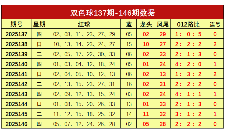 双色球第2025146开奖奖号:红球05、07、08、24、26、28,蓝球02。龙头05,凤尾28,012路比为2:2:2,未开出连号。