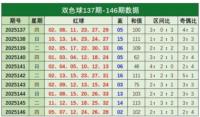 上期和值为:102,近10期和值分别为:100、111、109、62、46、111、75、103、113、102,预计本期和值走势范围下降,本期推测红球和值出现范围在105-120区间。