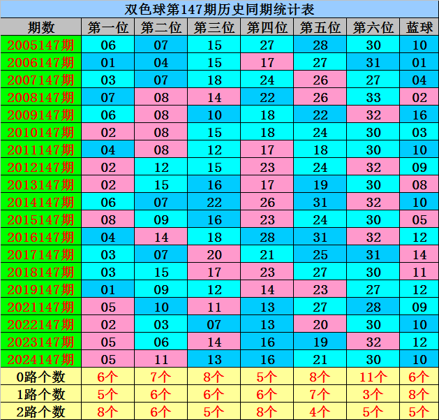 第五位:历史同期0路红球开出:18、21、24、27;1路红球开出;19、22、25、28、31;2路红球开出;20、23、26,红球012路个数比为8:7:4,去年同期开出0路奖号之后,今年同期防0路红球再出,参考红球24。