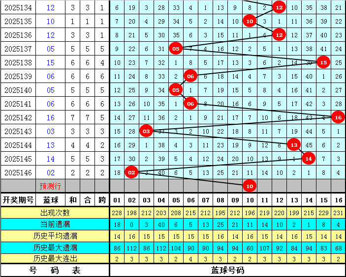 蓝球:历史同期0路号开出:03、09、12;1路号开出;01、04、10、16;2路号开出;02、05、08、11、14,蓝球012路个数比为6:8:5,去年同期开出1路蓝球之后,今年同期防1路号再出,参考蓝球10。