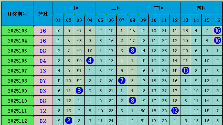 上期蓝球开出号码02,近十期蓝球在一区开3枚,二区开出号码3枚,三区开出1枚,四区开出3枚,区间比3:3:1:3,本期推荐蓝球出现在四区,重点关注15。