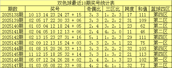 南华天第2025148期双色球区间号码个数统计分析:(红球:01-11为一区,12-22为二区,23-33为三区;蓝球:01-04为一区,05-08为二区,09-12为三区,13-16为四区)