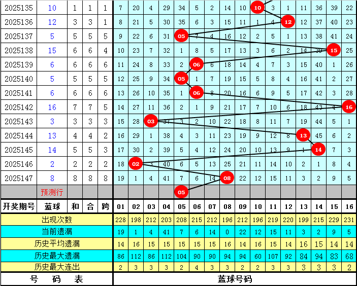 蓝球分析【一区01-04,二区05-08,三区09-12,四区13-16】:上期蓝球为08,出现在第二区,近50期区间比为12:14:12:12,近10期区间比为2:4:0:4,本期继续关注第二区蓝球号码,看好蓝球05。