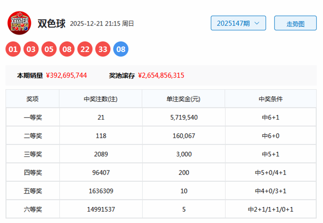 双色球第2025147期开奖号码为:01、03、05、08、22、33+08。其中红球三区比为4:1:1,奇偶比为4:2,包含1个重号:05,蓝球出现在第二区。