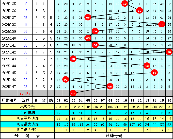 上期开出蓝球号码08,该号码在最近300期中出现了15次,其下期分别开出:蓝球12出现3次,蓝球06、11、13出现2次,蓝球01、04、08、09、15出现1次,蓝球02、03、05、07、10、14、16出现0次。本期五码蓝球参考03、06、10、13、15,独蓝关注03。