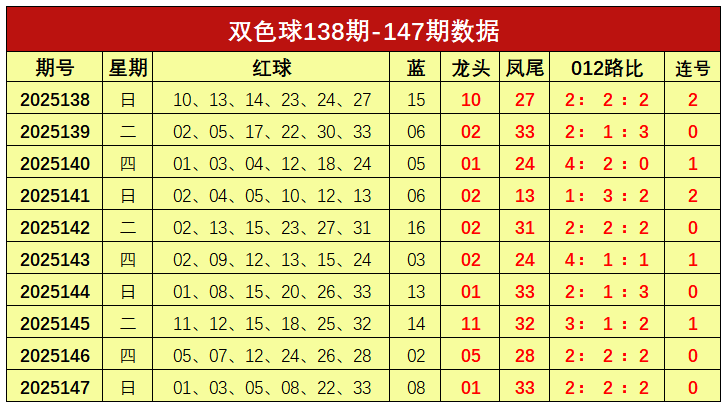 双色球第2025147开奖奖号:红球01、03、05、08、22、33,蓝球08。龙头01,凤尾33,012路比为2:2:2,未开出连号。
