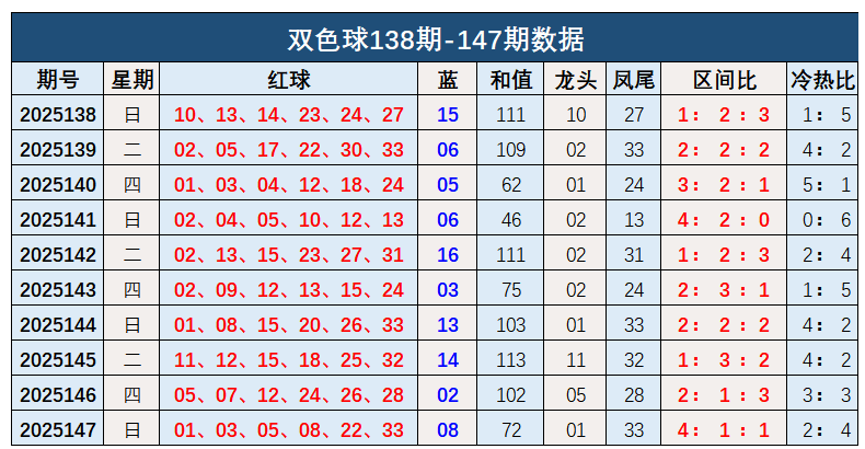 双色球第2025147开奖奖号:红球01、03、05、08、22、33,蓝球08。和值72,龙头01,凤尾33,区间比4:1:1,冷热比2:4。蓝球开出小数号码08。