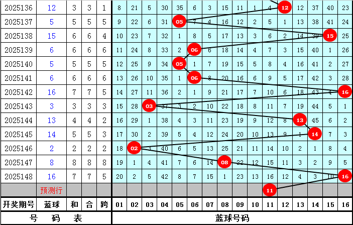 蓝球推荐:蓝球上期奖号为16,开出偶数蓝球,本期注意蓝球转向,看好奇数蓝球号码出现,参考五码蓝球04、06、08、11、14。
