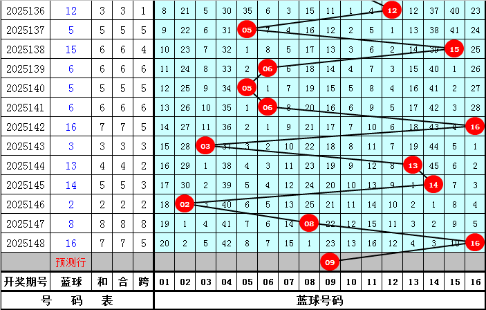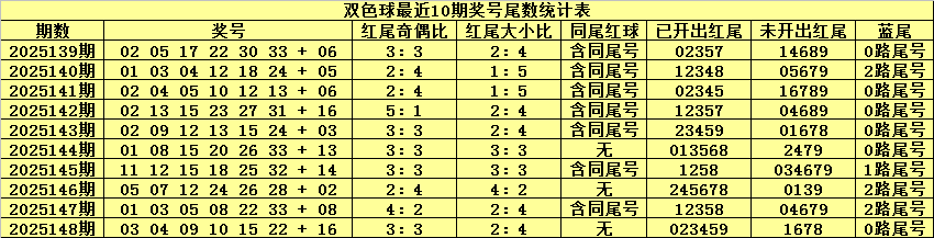 双色球第2025148期奖号为:03 04 09 10 15 22 + 16,红球尾数为:023459,没有出现同尾红球。