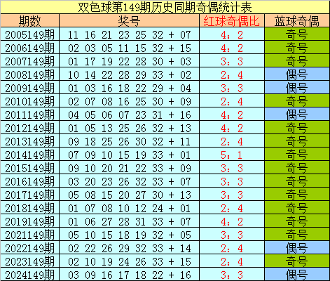 蓝球分析:在第149期历史同期开奖中,蓝球号码奇偶比为14:5,最近5年同期奇偶走势为:奇、奇、偶、奇、偶,今年同期看好开出奇数蓝球,参考号码15。