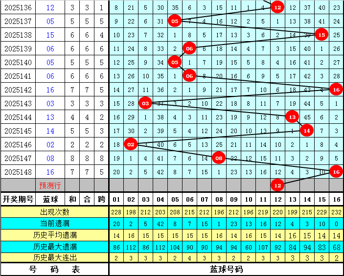上期开出蓝球号码16,该号码在最近300期中出现了24次,其下期分别开出:蓝球05出现3次,蓝球01、03、04、08、11、13出现2次,蓝球02、06、09、10、12、14、15、16出现1次,蓝球07出现0次。本期五码蓝球参考05、12、14、15、16,独蓝关注12。